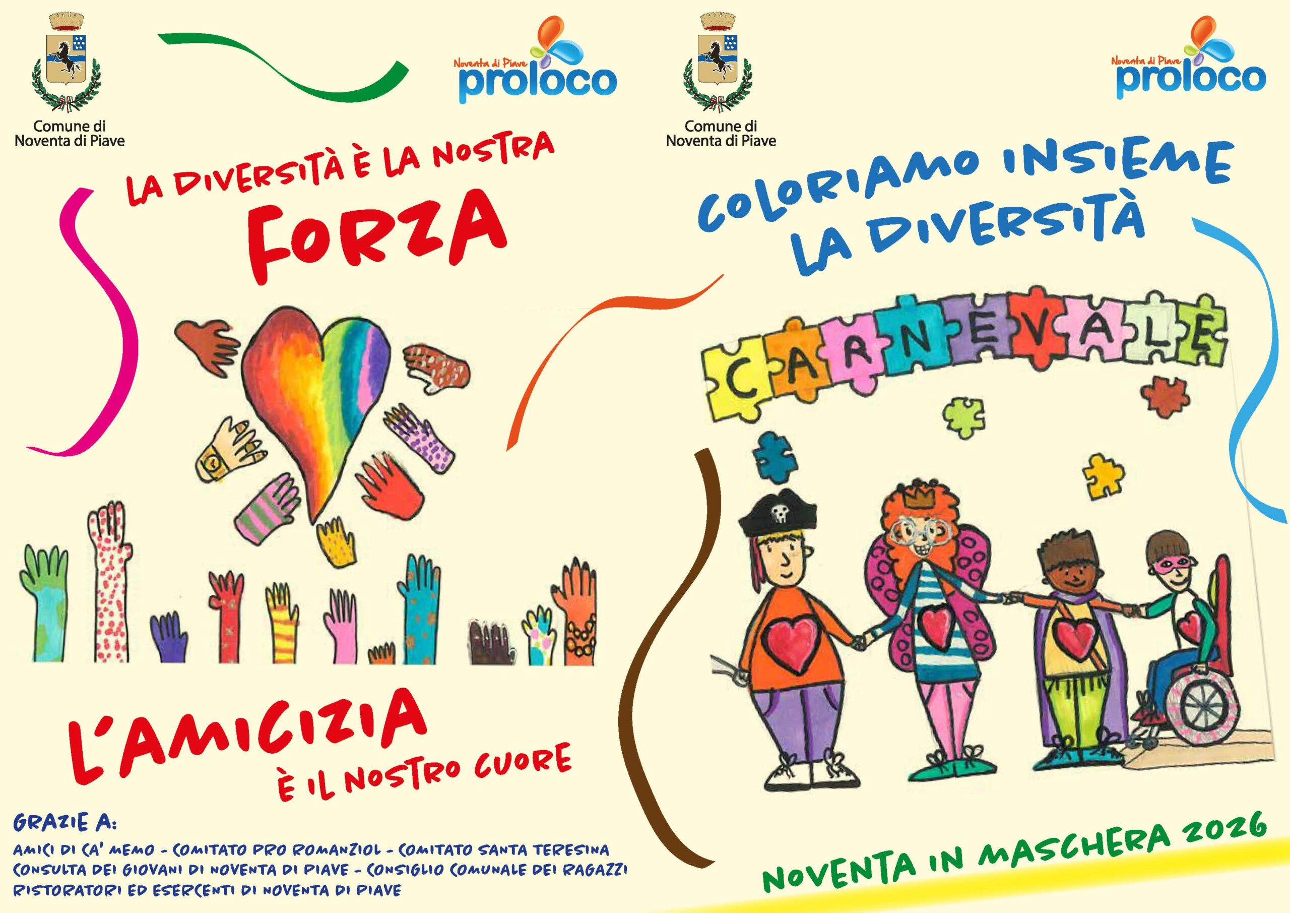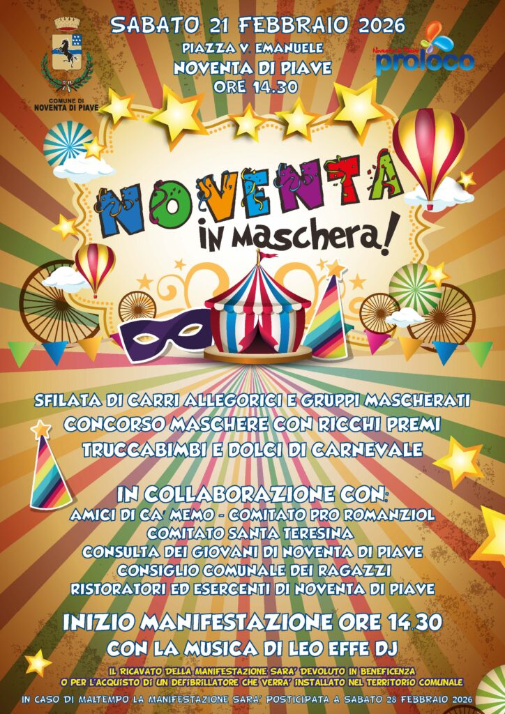 Eccoci quà puntuali col divertimento di NOVENTA IN MASCHERA! Come gli anni scorsi tornano i carri mascherati, il concorso mascherine con tanti premi, il buffet con i dolci di carnevale e, quest’anno due novità. La prima: come ogni anno il disegno che fa da copertina al nostro volantino è stato scelto tra tutti i lavori che i ragazzi delle nostre scuole hanno fatto nei mesi scorsi. E il 21 febbraio TUTTI i lavori dei ragazzi saranno esposti nel gazebo dedicato alla mostra dei disegni. La seconda novità riguarda il percorso della sfilata: i carri non arriveranno più da via Piave ma percoreranno via ROMA, la piazza V. Emanuele poi piazza Marconi e ritorno. 600 metri di sfilata per non perdere nemmeno un particolare dei 7 carri. E, passati i carri, la sfilata sul palco delle mascherine in concorso con i consueti ricchi premi. Iniziamo alle 14,30 con la musica di Leo Effe DJ, alle 15 sfilata dei carri e apertuta del buffet con le crepes del Comitato Pro Romanziol, le “fritoe” e le fritelle “siora Gigia” del comitato Santa Teresina, i dolci di carnevale degli Amici di Ca’ Memo e le bevande della Pro Loco di Noventa di Piave. A seguire sfilata e premiazione mascherine.